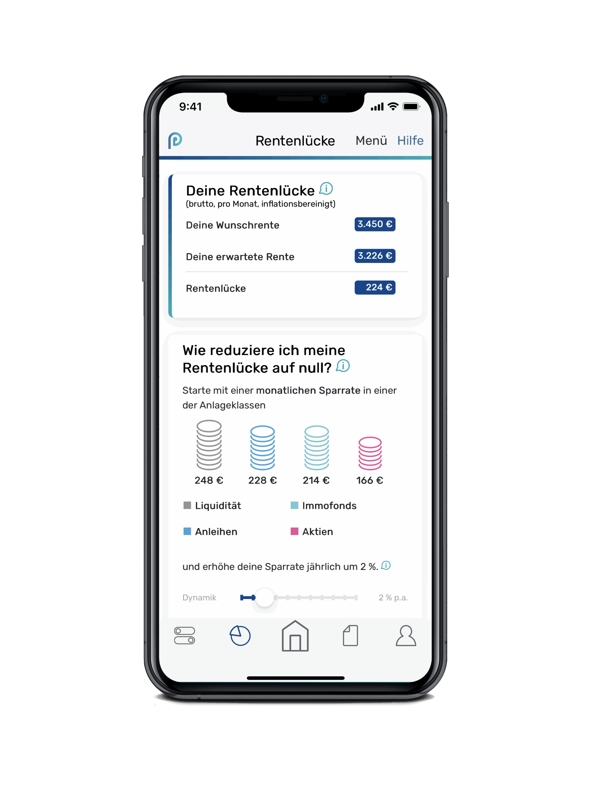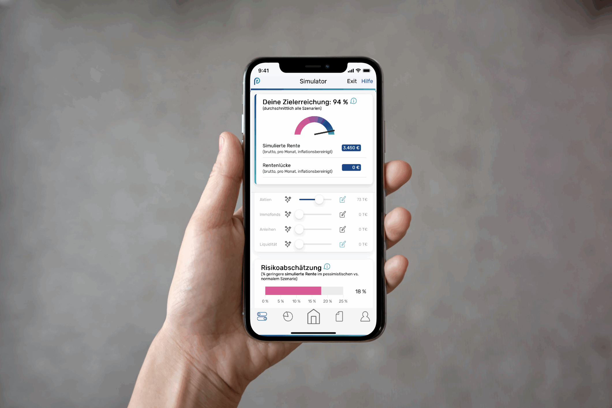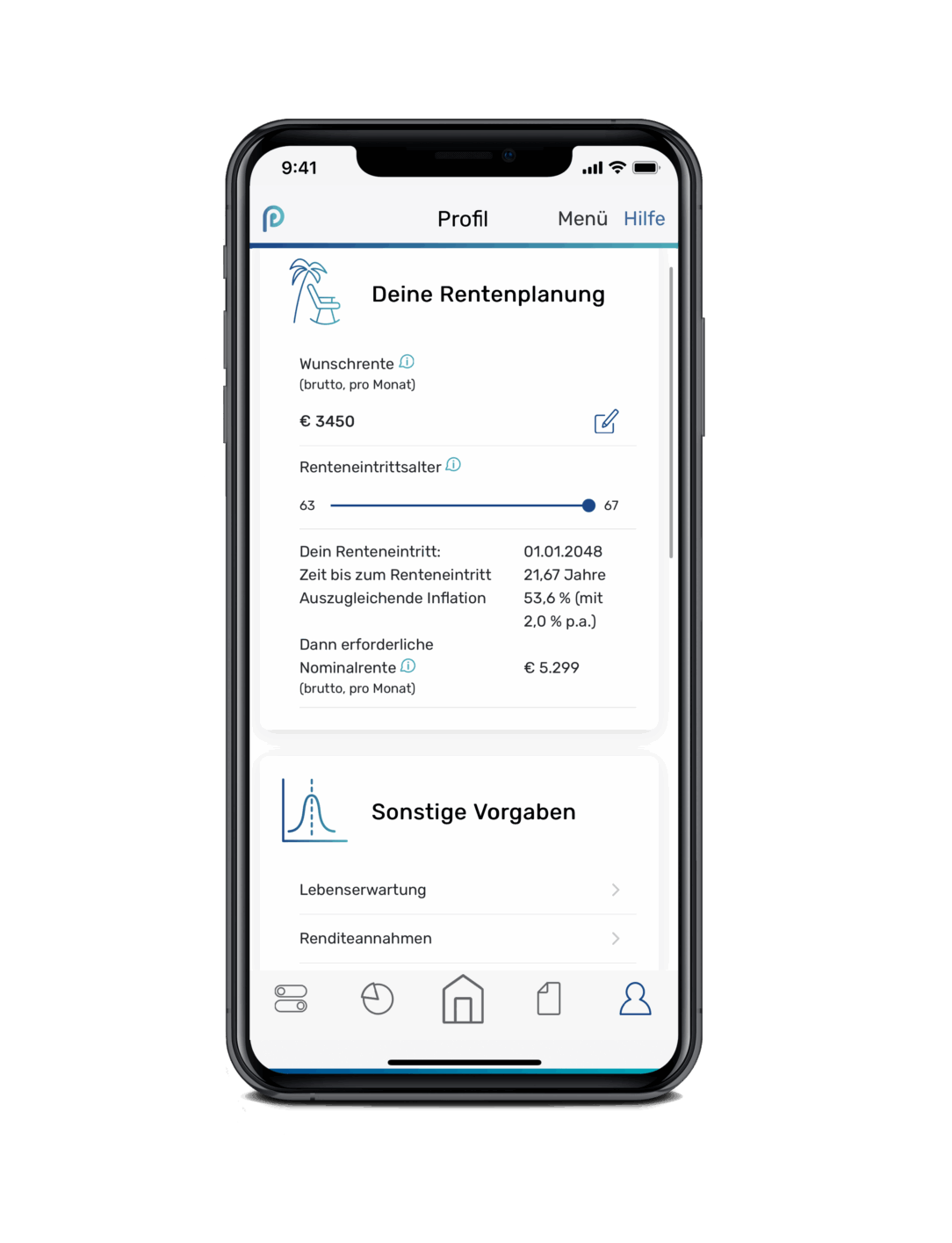 Auf Basis deiner Eingaben und unseren fundierten Berechnungen erhältst du einen leicht verständlichen Überblick zu deiner finanziellen Altersvorsorgesituation. Die App arbeitet wie ein Navigationsgerät und zeigt dir auch bei Veränderungen immer an, wie du dein Rentenziel wieder erreichen kannst.