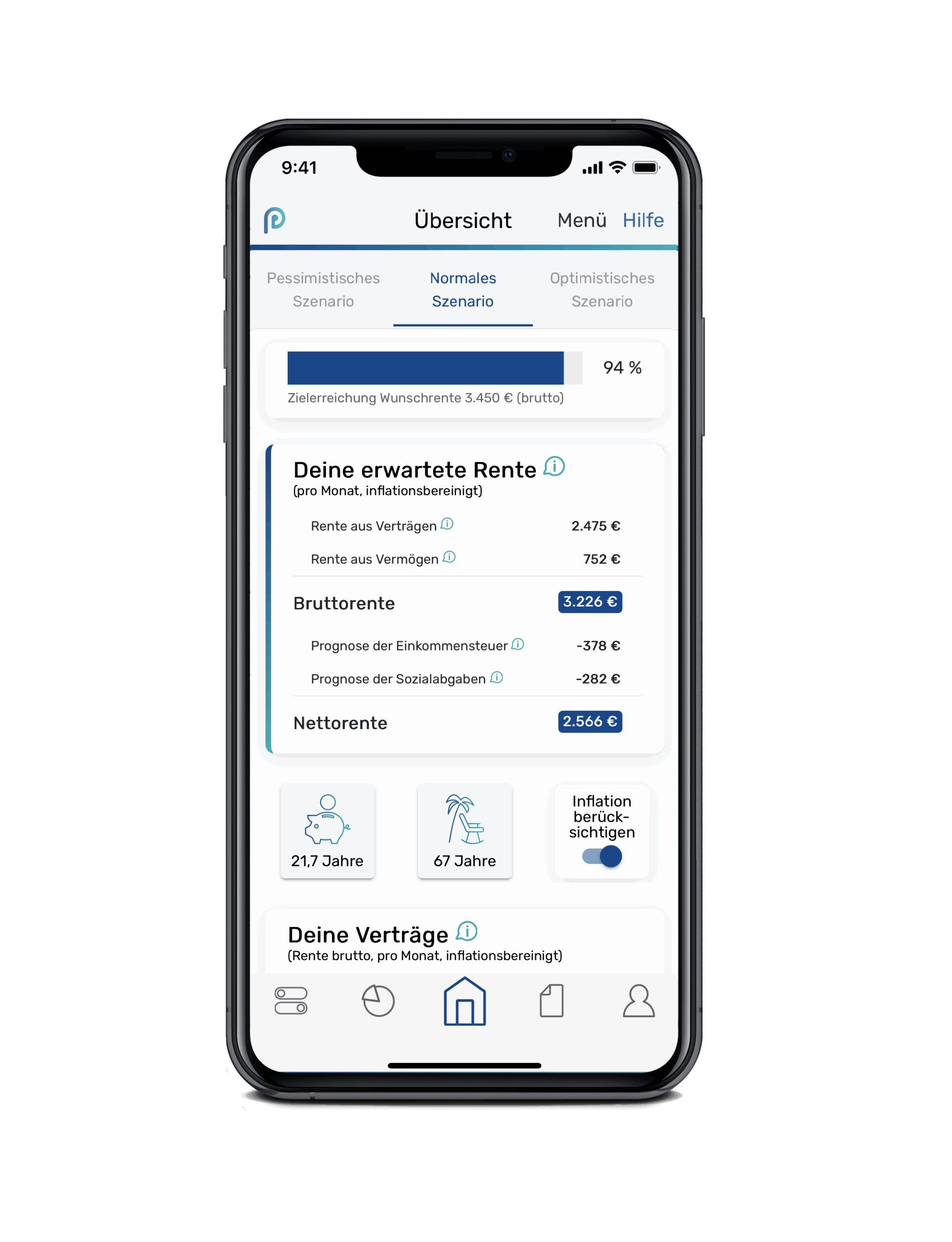 Du siehst nicht nur die Bruttorente, sondern auch die Nettorente. So kannst du realistischer einschätzen, wie viel Geld dir nach Steuern, Sozialabgaben und unter Berücksichtigung der Inflation wirklich bleibt.